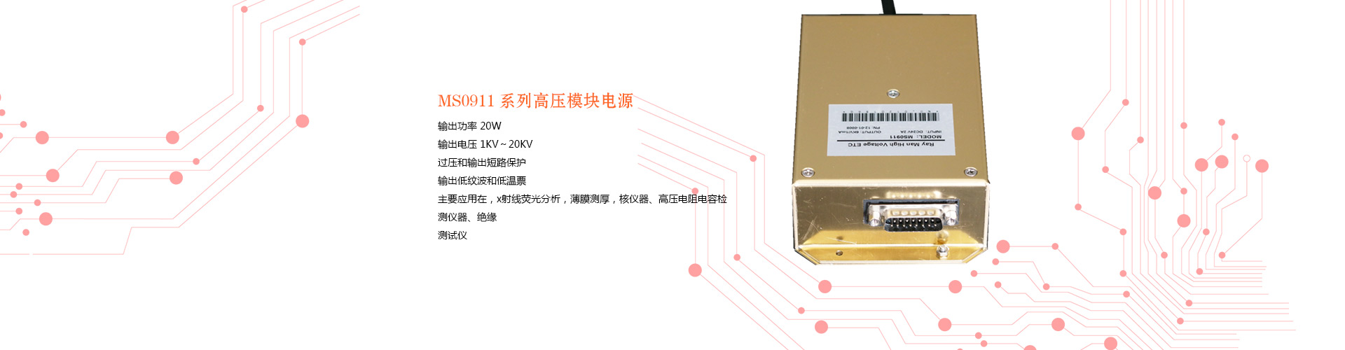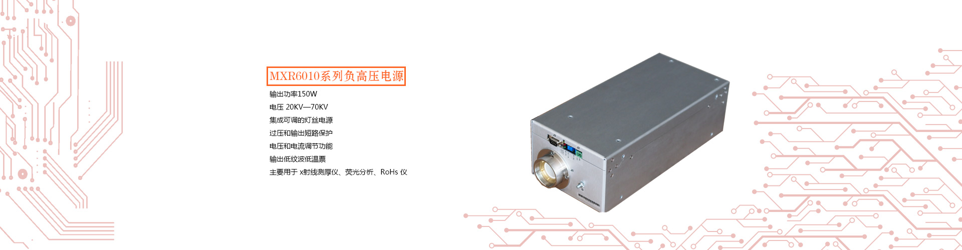 MXRN 系列負高壓電源是 X 光機專用高壓電源,射線管陽極接地易于散熱。它集成了懸浮可調(diào)的燈絲電源。電源輸出穩(wěn)定低溫漂的高壓,燈絲電源及管流閉環(huán)控制,主要用于熒光分析、RoHs 儀、 測厚儀等。